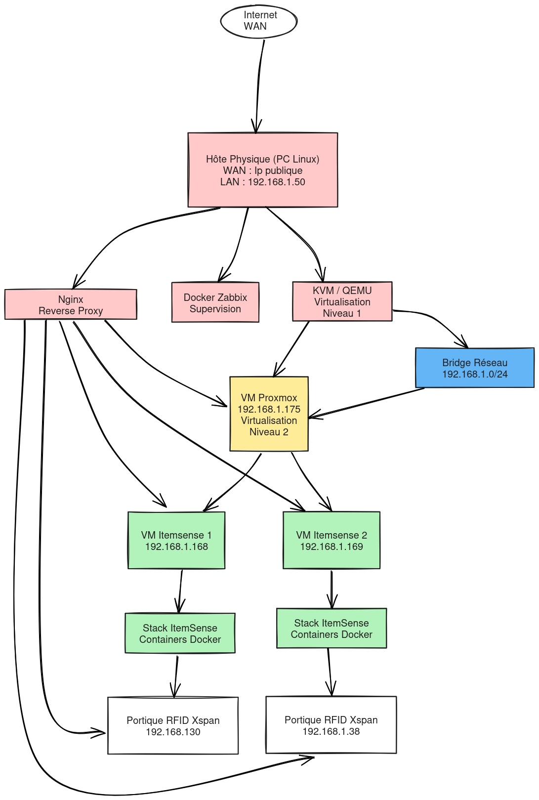 Ce projet a pour but de tester la faisabilité d'installer un hyperviseur Proxmox dans une machine virtuelle et de créer plusieurs machines virtuelles Itemsense contenant chacune un environnement virtualisé Docker avec les containers de la stack Itemsense/Impinj afin de pouvoir répartir la gestion de nombreux portiques RFID (Xspan).